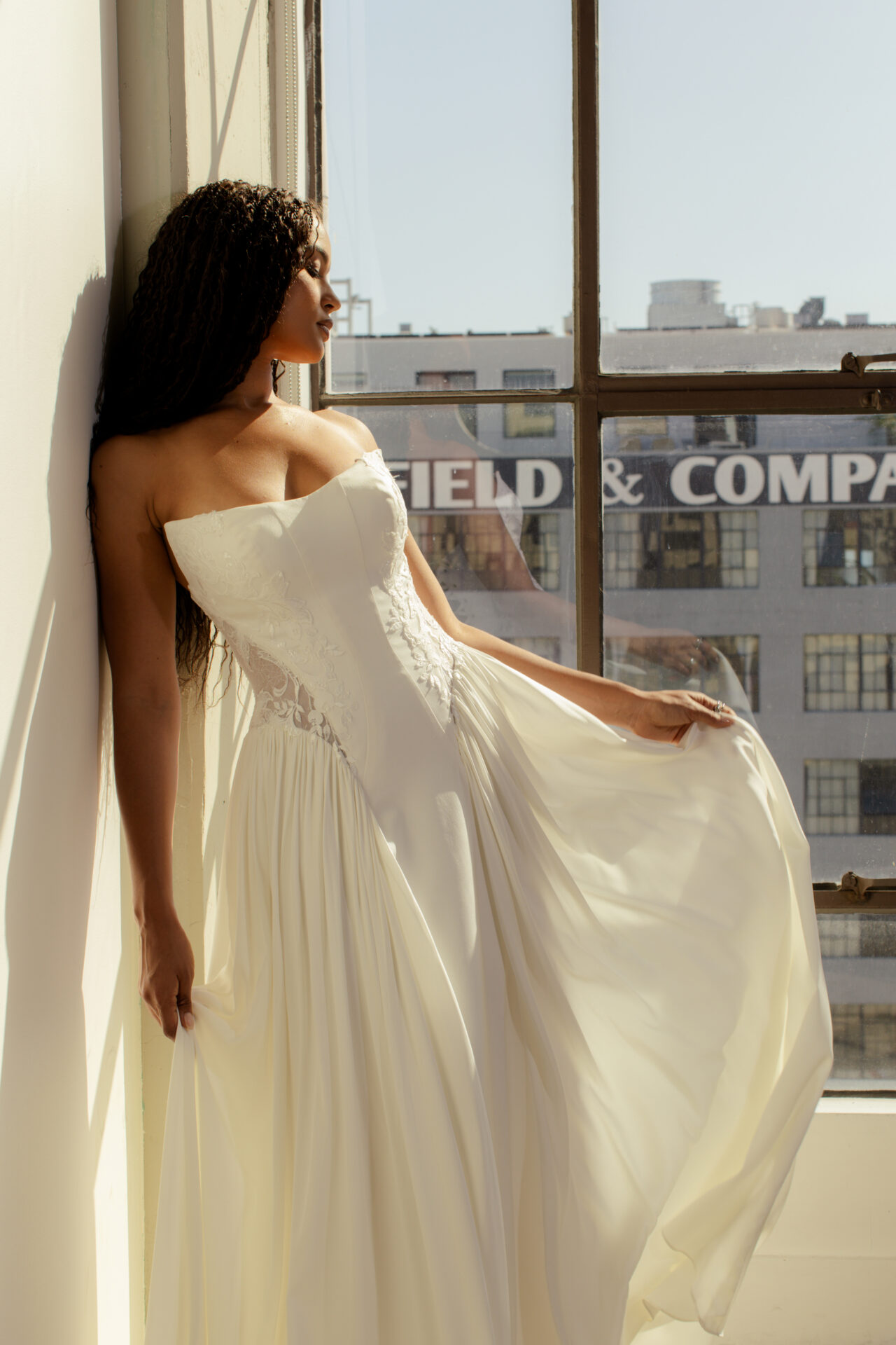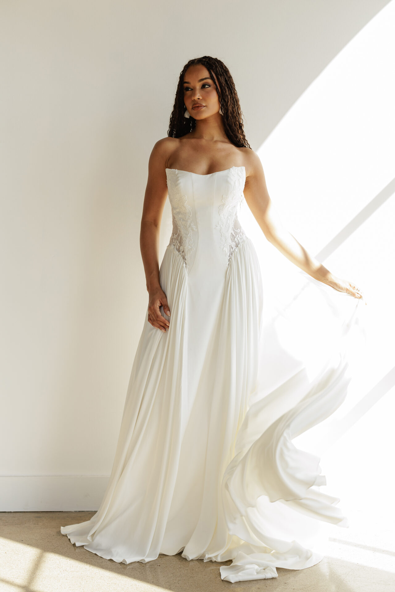 Designed by All Who Wander, this stunning creation blends sleek structure with soft, gathered movement in a way that feels both sophisticated and effortlessly cool. The strapless bodice features a chic cat-eye neckline—already a statement—adorned with shimmering lace placements that cascade through the sides and back. But here's where it gets really interesting: the bold side cutouts add an edge that says "I'm not playing it safe," revealing the waist before flowing into a front panel of silk double crepe that falls seamlessly through the center.